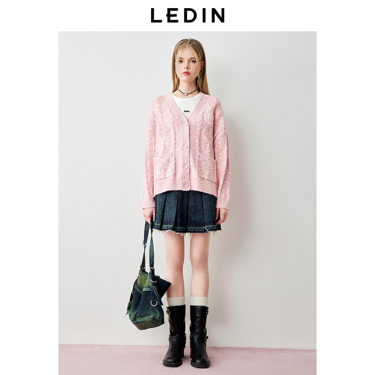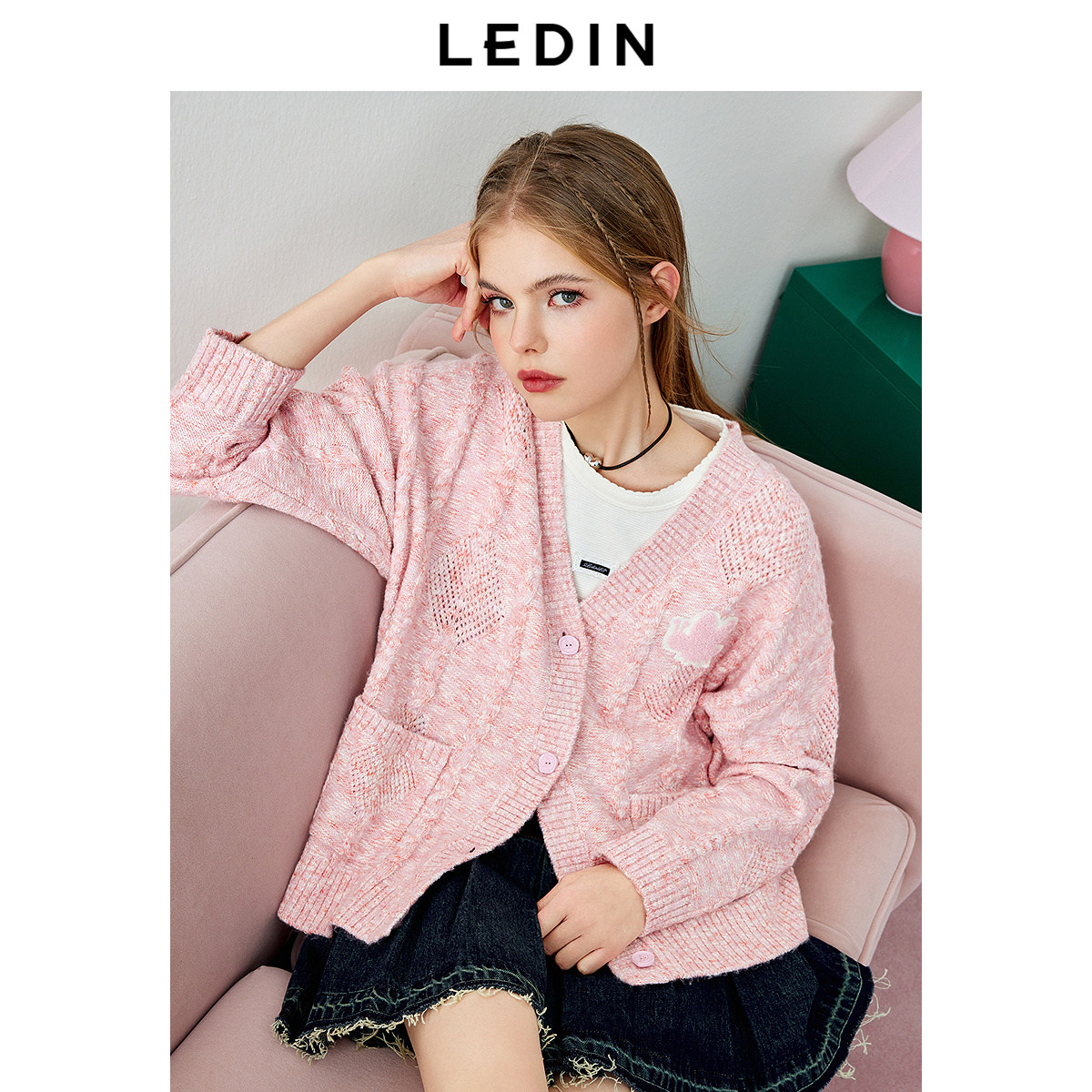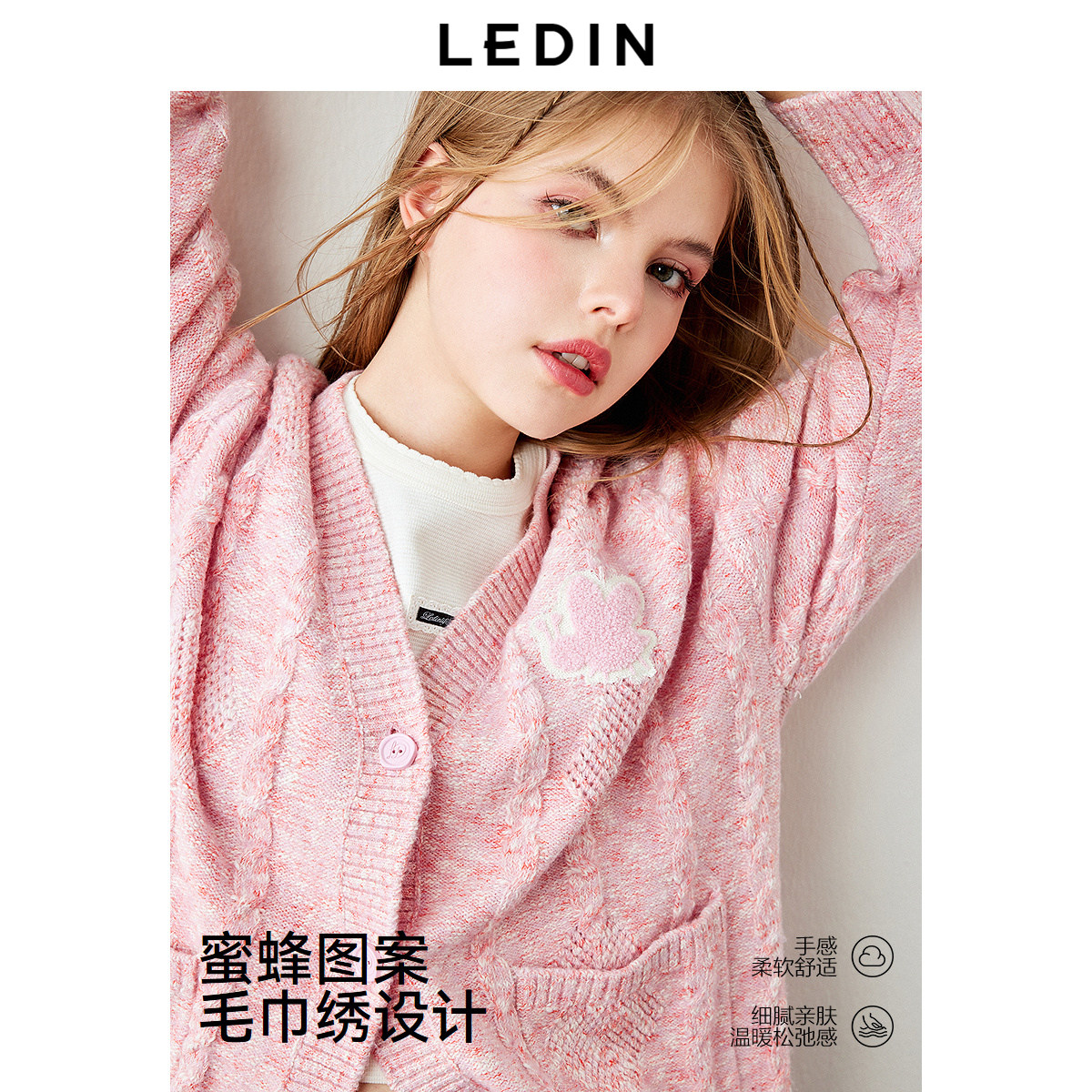 乐町复古绞花宽松针织开衫秋季粉色V领蜜蜂开衫外套