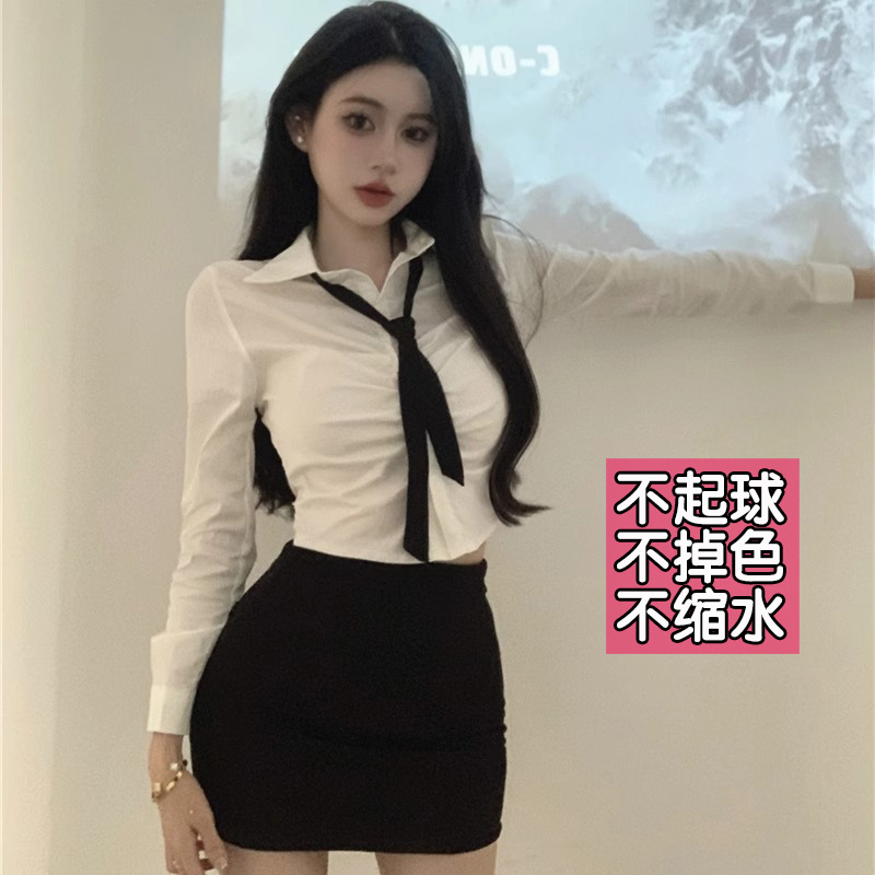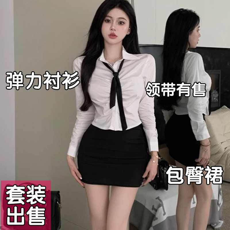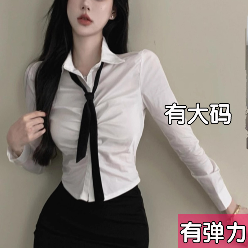 加肥加大码白色长袖弹力衬衫女辣妹纯欲衬衣领带上衣胖mm春夏套装