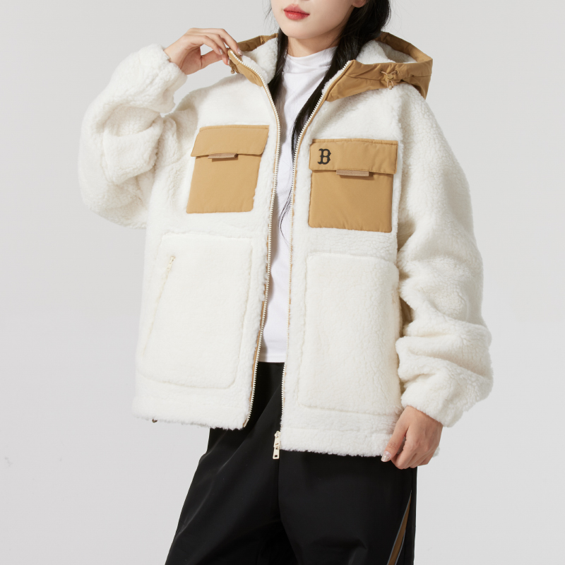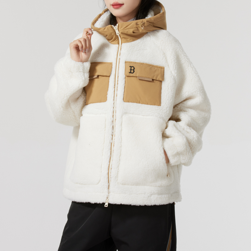 MLB基础系列女子时尚拼色羊羔绒外套保暖舒适连帽抓绒服休闲上衣