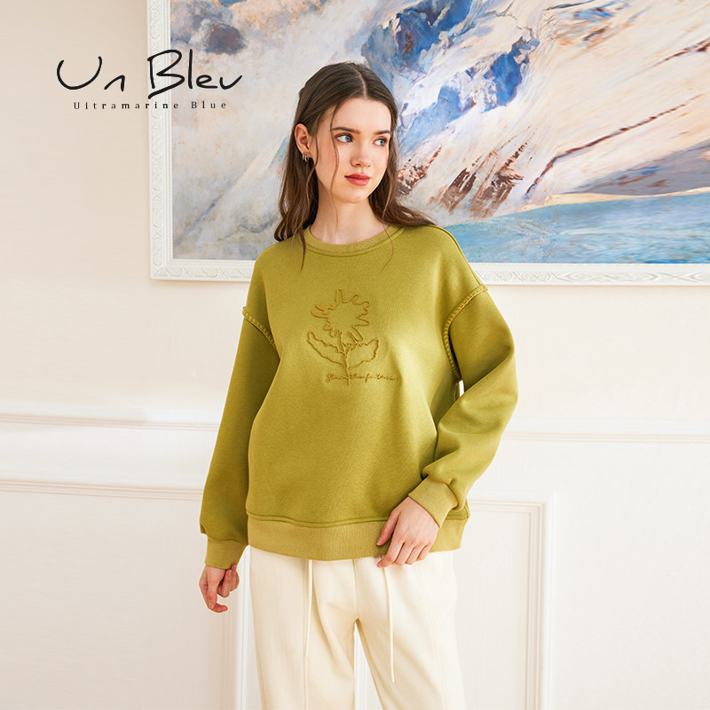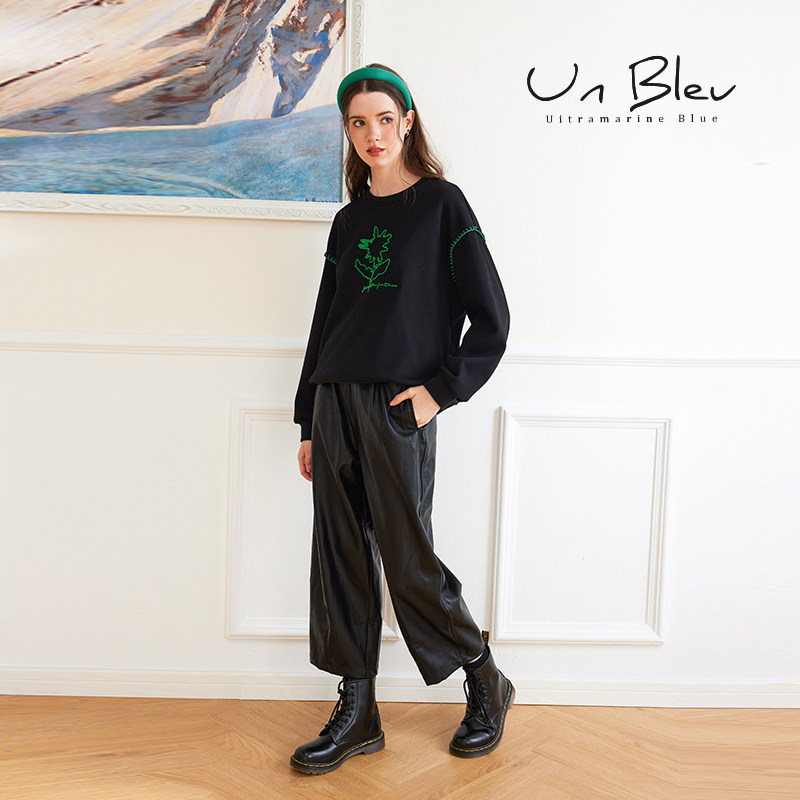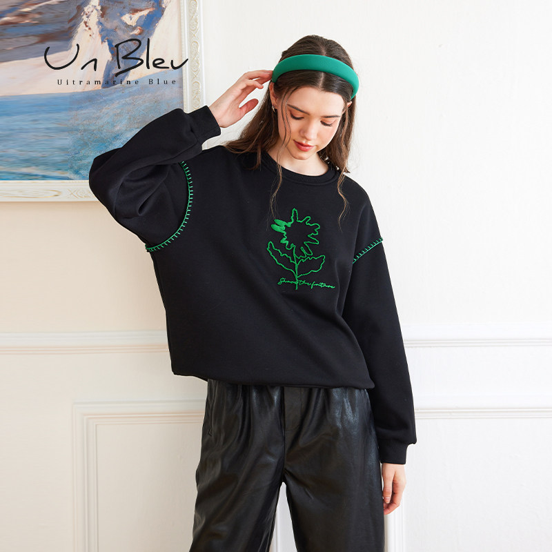 UnBleu圆领卫衣女秋冬新款加绒加厚女装美式休闲保暖黑色上衣