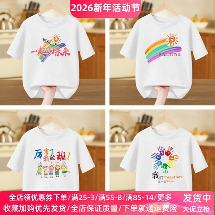 幼儿园亲子活动班服夏季短袖纯棉白色t恤彩虹笑脸国庆儿童表演服