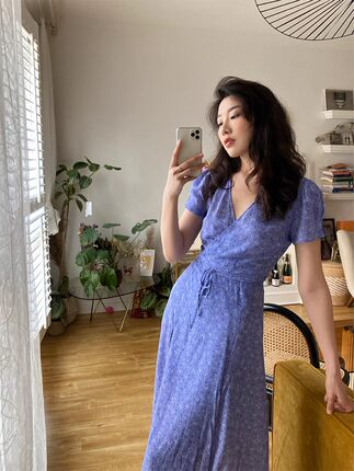 尺下法式复古碎花真丝连衣裙女夏V领一片式裹身裙短袖中长款裙子