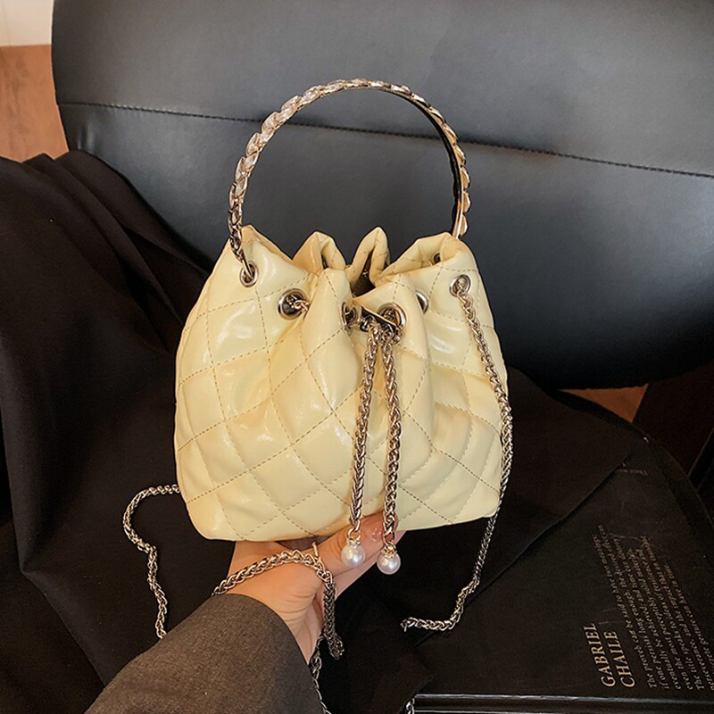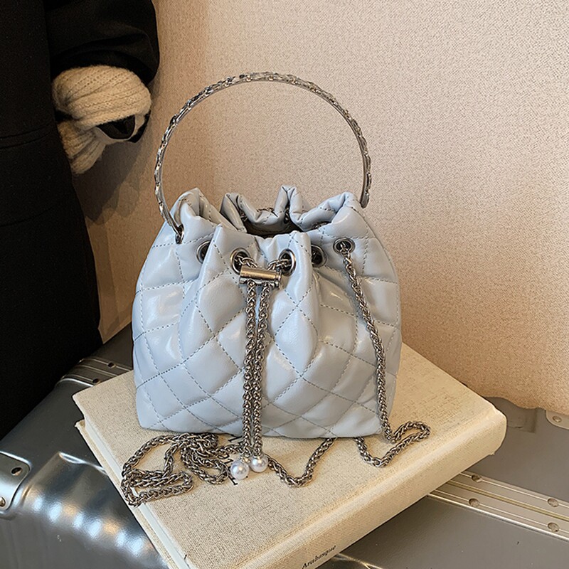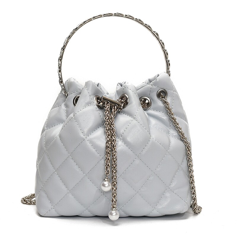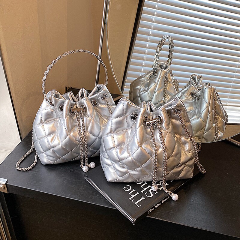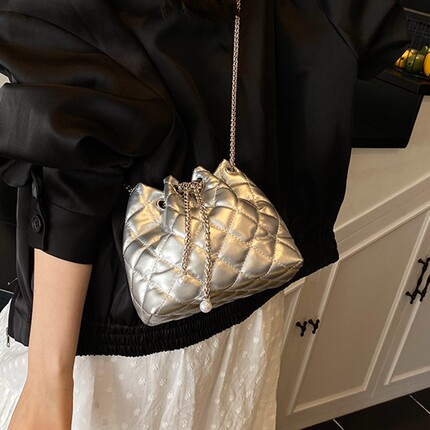 夏天流行银色小包包女2025新款时尚菱格链条包超火斜挎手提水桶包