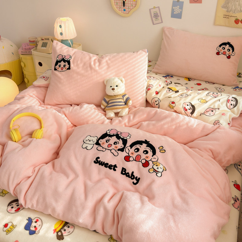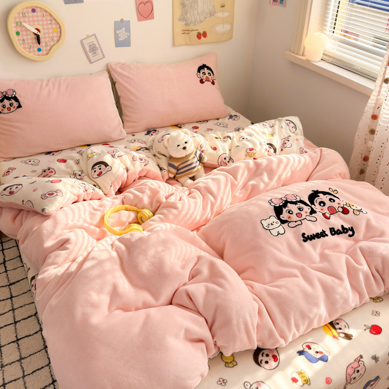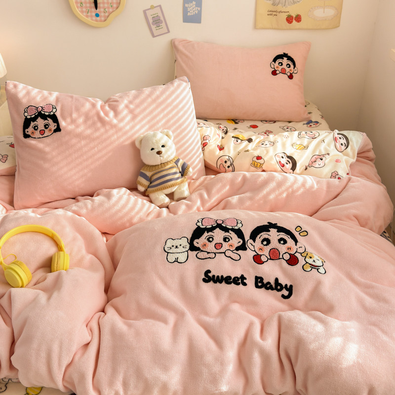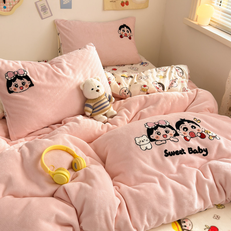 冬季ins少女保暖毛巾绣牛奶绒四件套双面绒珊瑚绒被套床单三件套