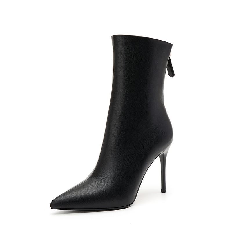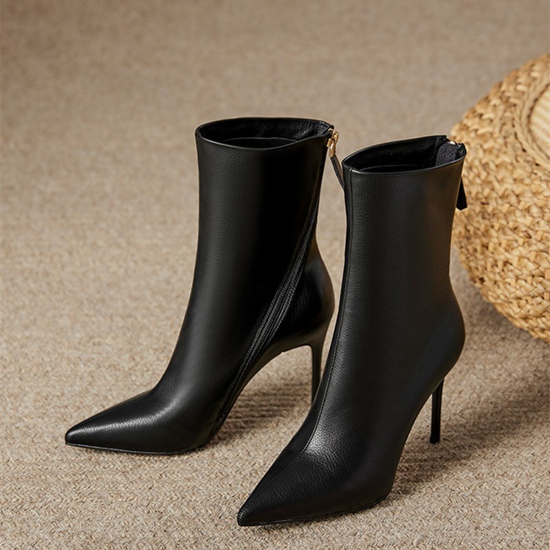 舒适柔软尖头细跟短靴真皮中筒靴2025秋冬高跟鞋加绒显瘦气质女靴