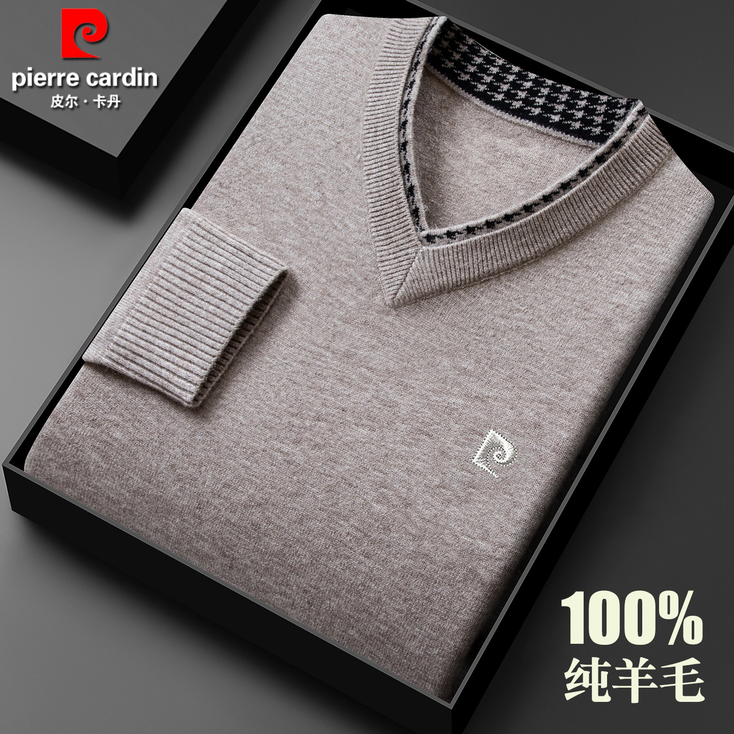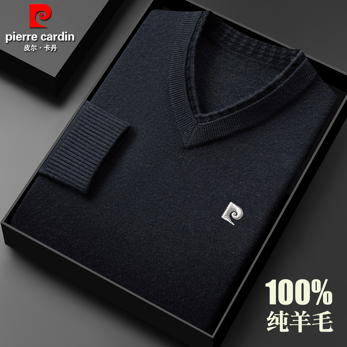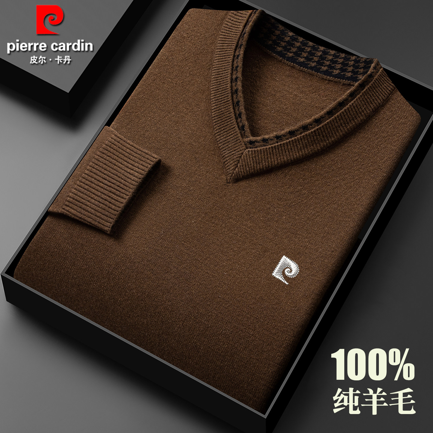 皮尔卡丹羊毛衫男士秋冬加厚鸡心V领针织打底衫本命年红色毛衣男