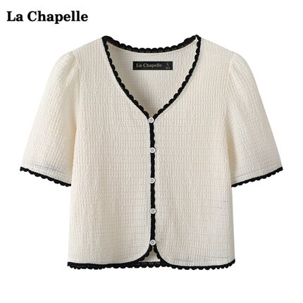拉夏贝尔/La Chapelle设计感V领短袖T恤女夏新款气质泡泡袖上衣