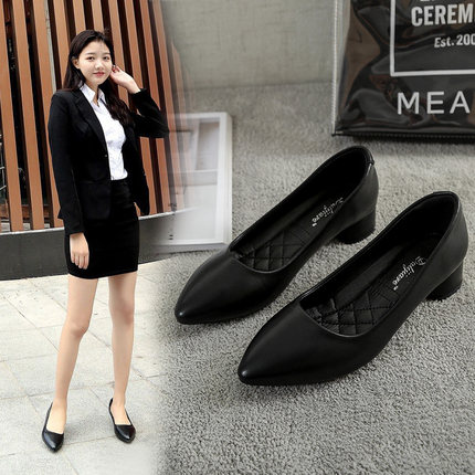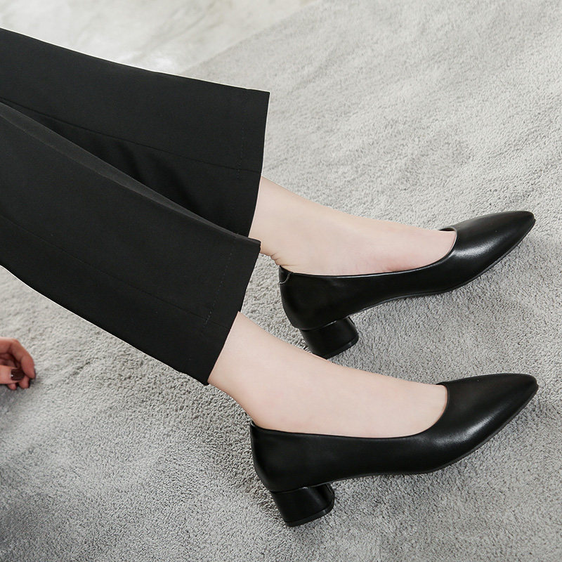 工作鞋子女黑色2021新款夏季职业D上班皮鞋尖头软底中跟粗跟单鞋