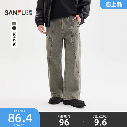 三福2026春季男士洗褪分割结构工装休闲裤 街潮直筒长裤513466