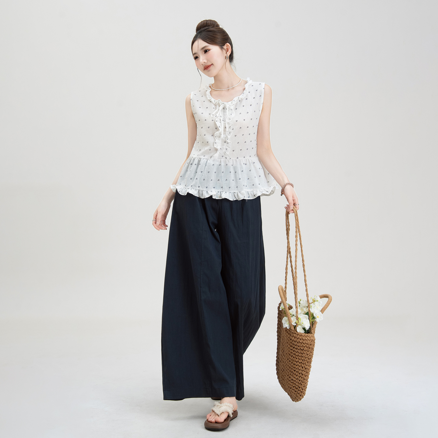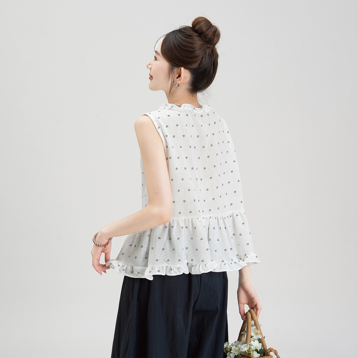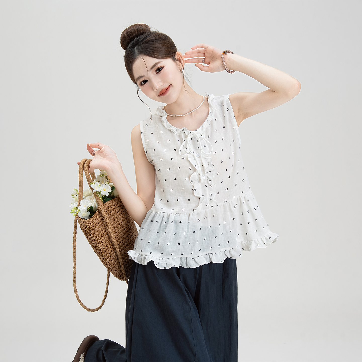 白色法式甜美木耳边爱心印花无袖衬衫女夏季新款宽松减龄背心上衣