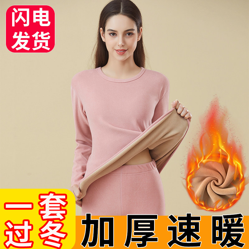 女士中高领加厚加绒保暖内衣套装秋冬大码德发热秋衣秋裤纯棉毛衫