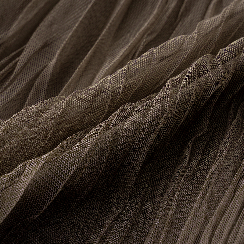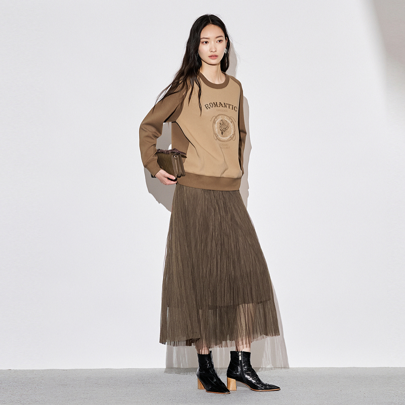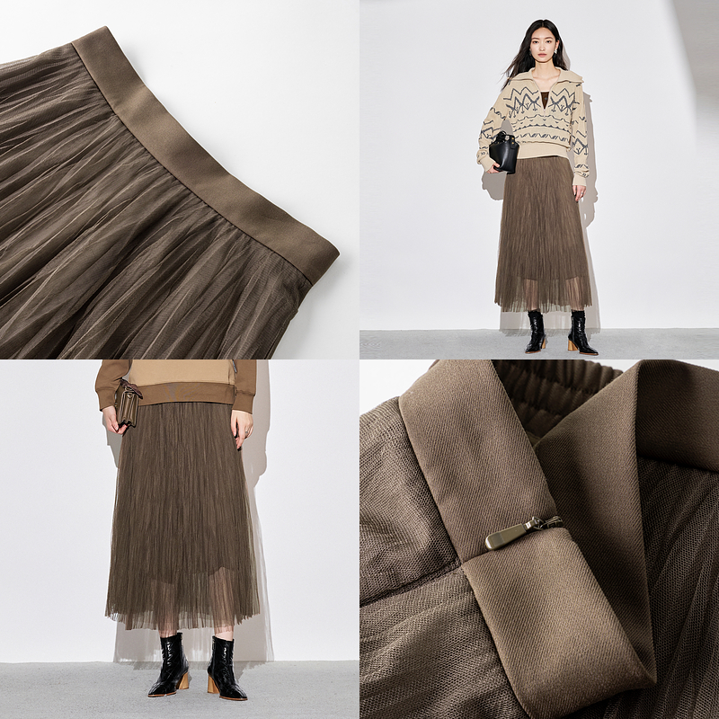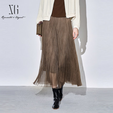 XG雪歌复古棕色网纱半身裙女2025秋款遮胯显瘦中长裙XK303022A172