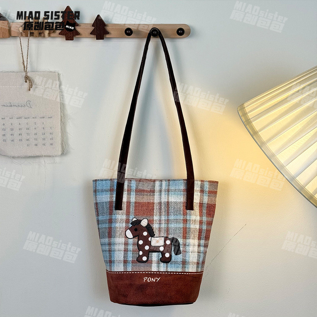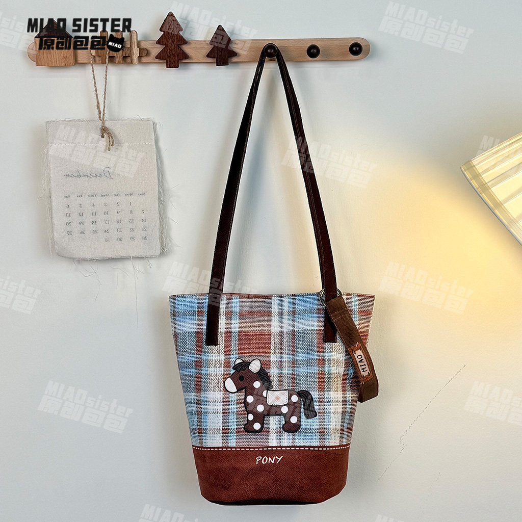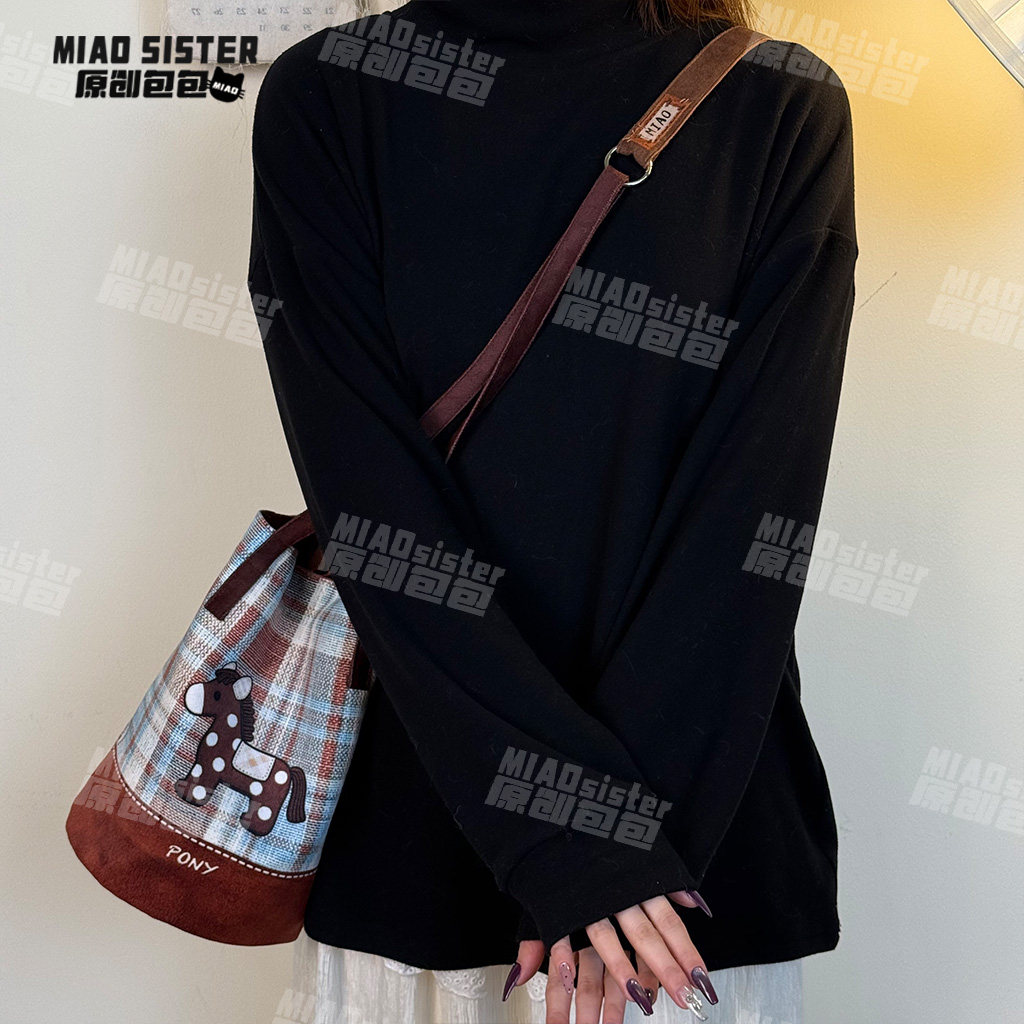 波点pony格纹复古百搭休闲单肩包印花水桶包大容量通勤帆布包新款