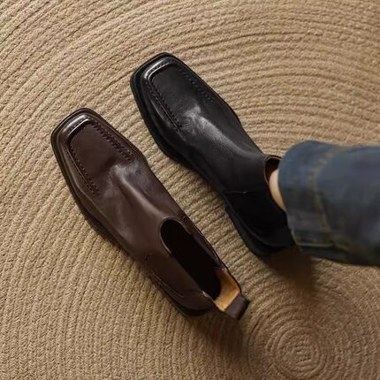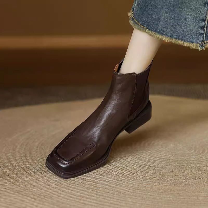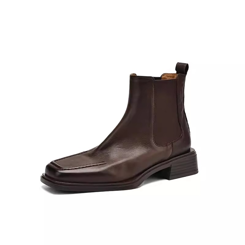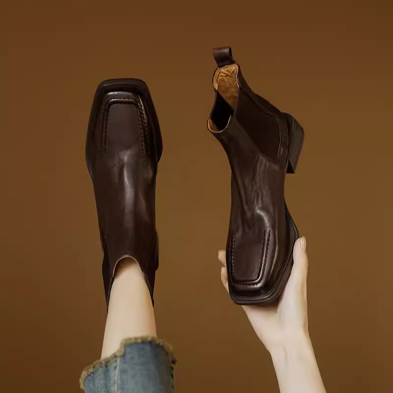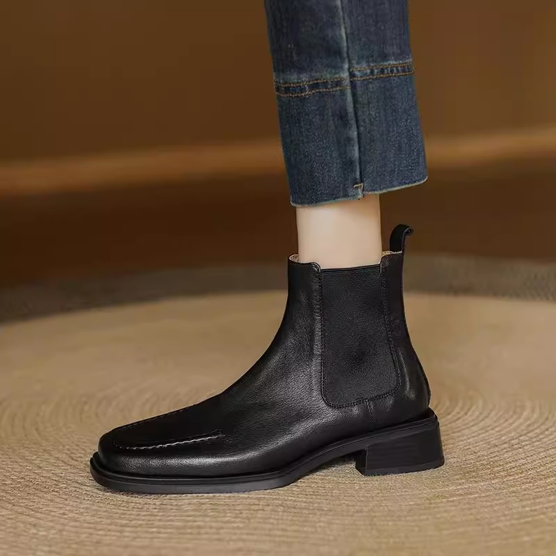 真皮复古切尔西短靴子女2025秋冬新款短筒烟筒粗低跟方头瘦瘦踝靴