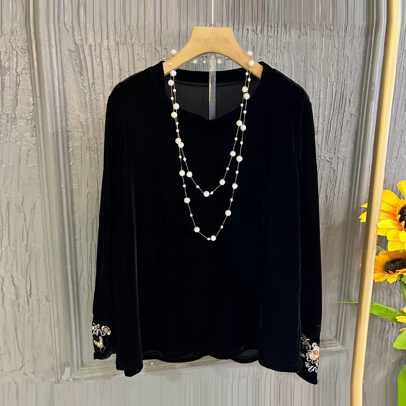 大码女装拼色边盘扣刺绣国风马甲拼接花朵袖口小衫松紧腰丝绒裤子