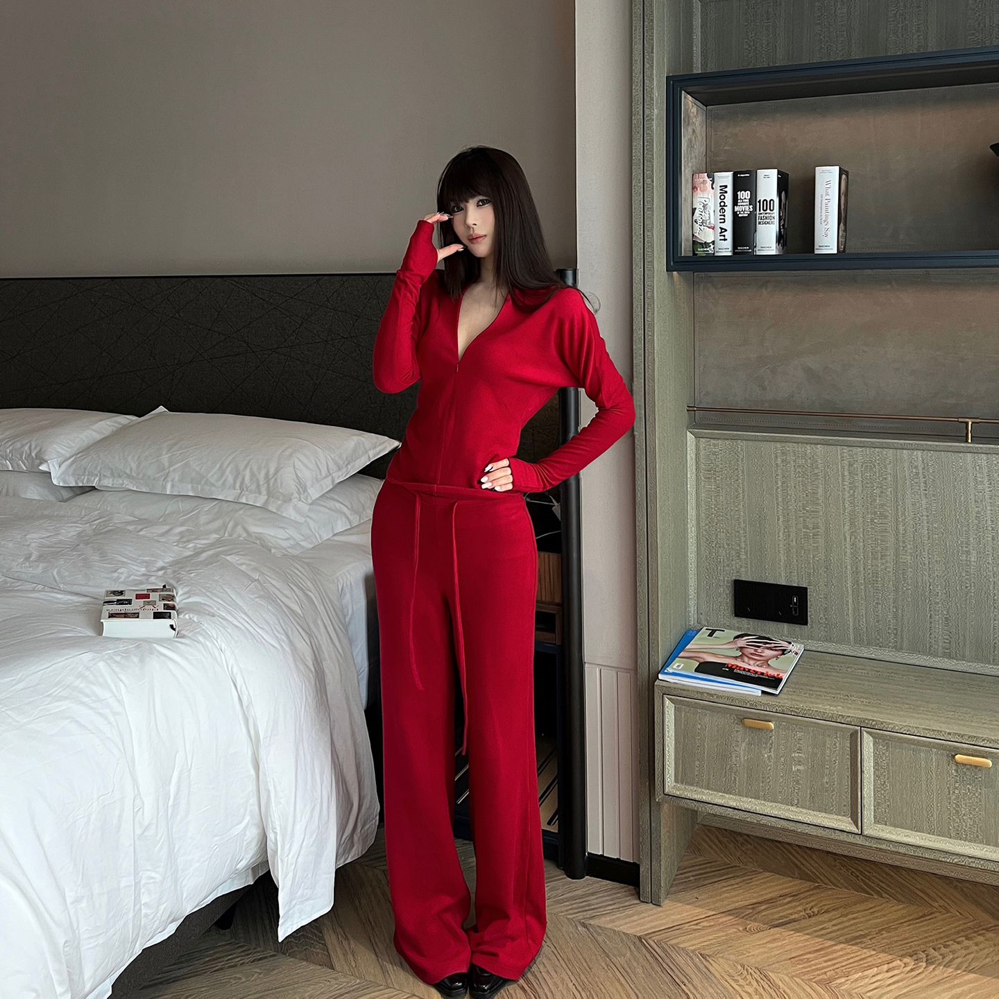 Lienni2025秋冬新款长袖v领百搭上衣女高腰显瘦阔腿裤羊绒三件套