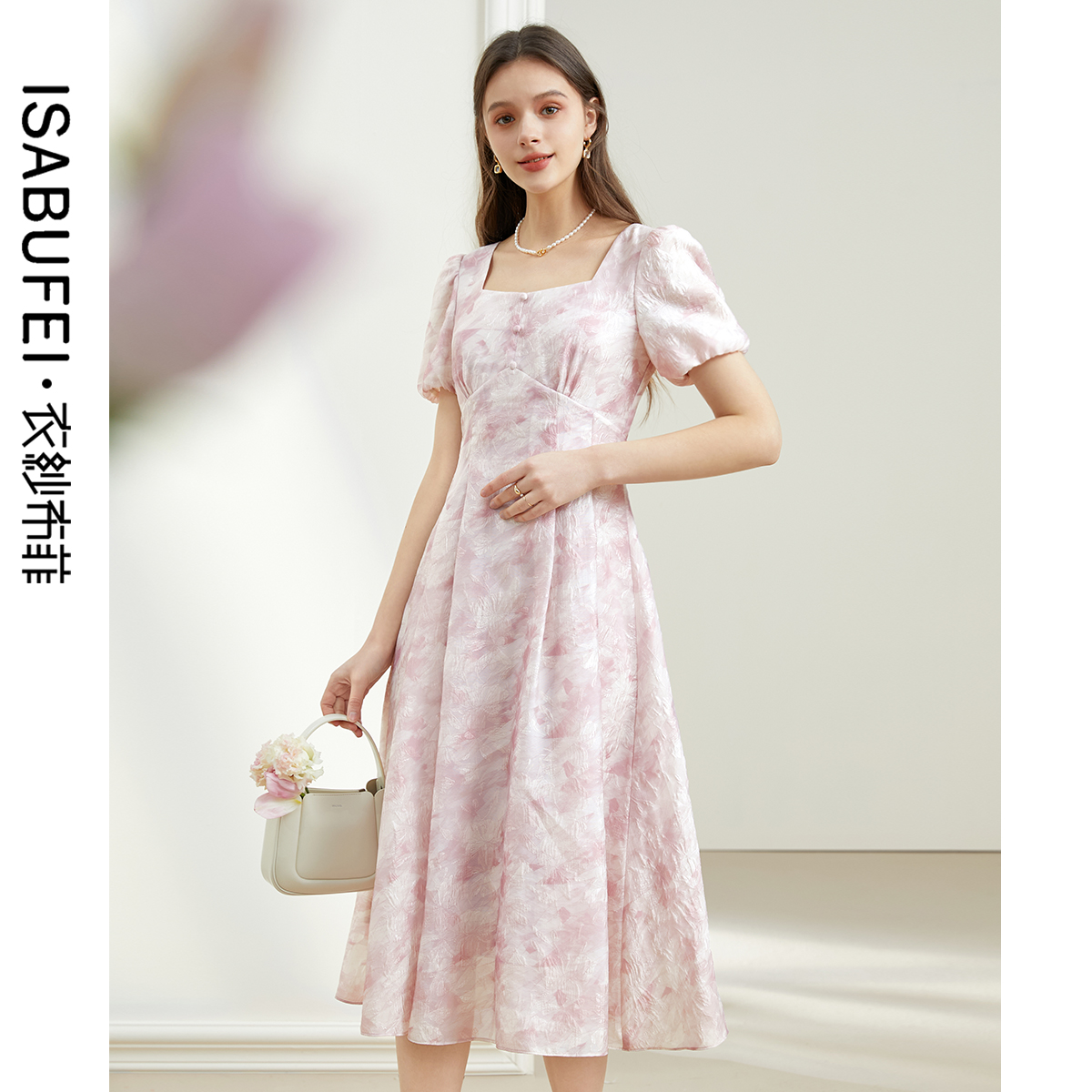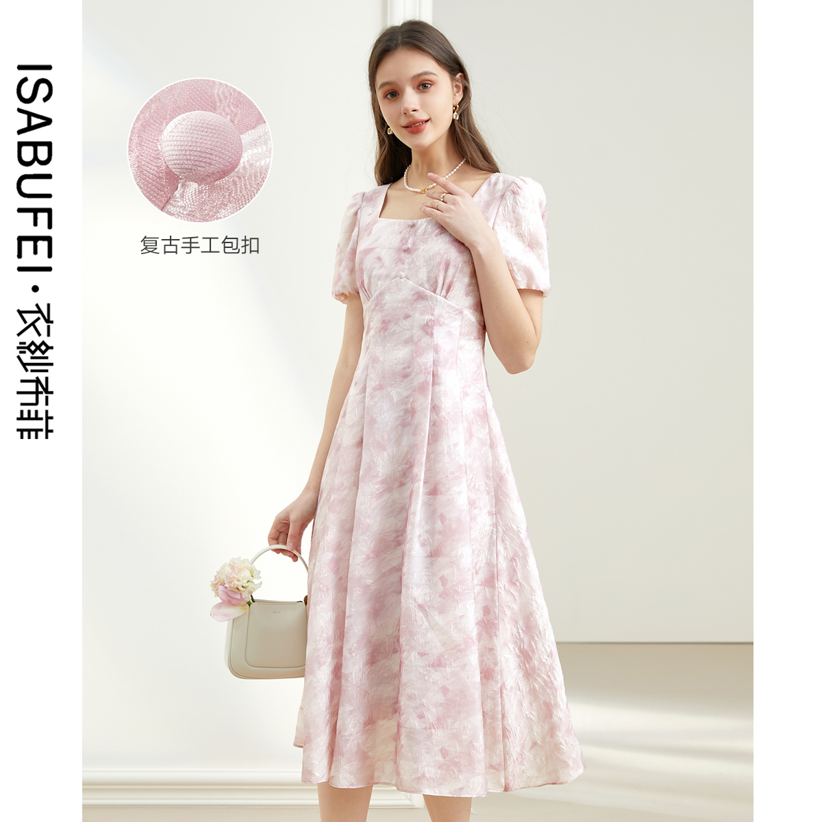 衣纱布菲芳菲法式油画连衣裙新款女夏泡泡袖收腰绝美粉色长裙