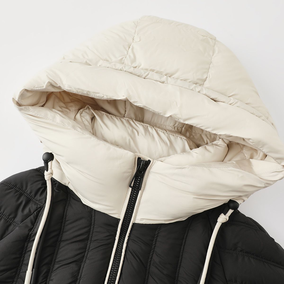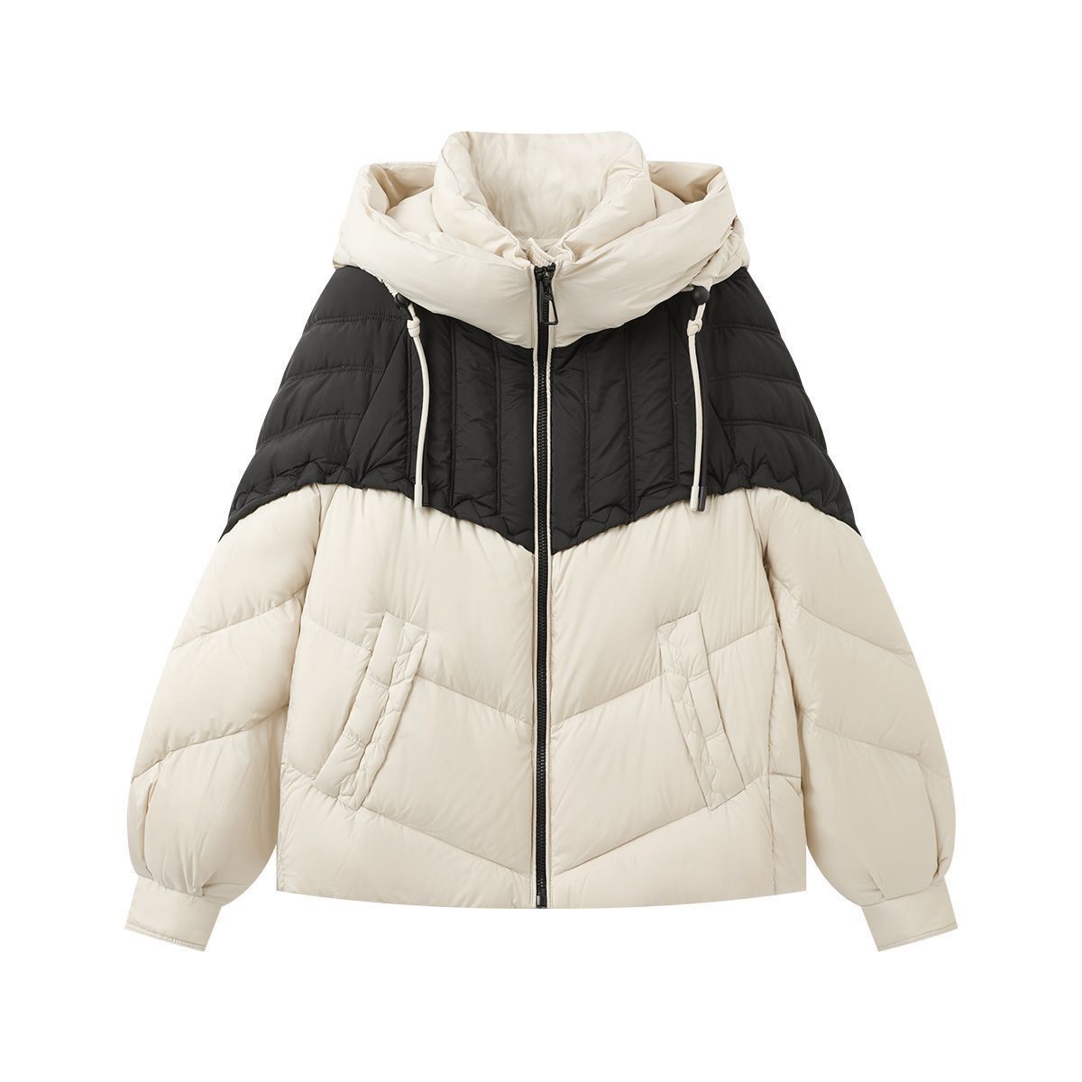 茵曼女士黑色连帽短款羽绒服秋冬时尚抽绳设计日常百搭保暖外套女
