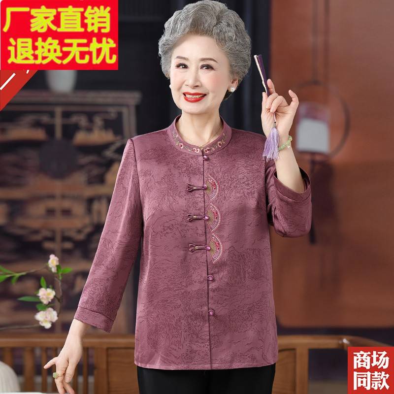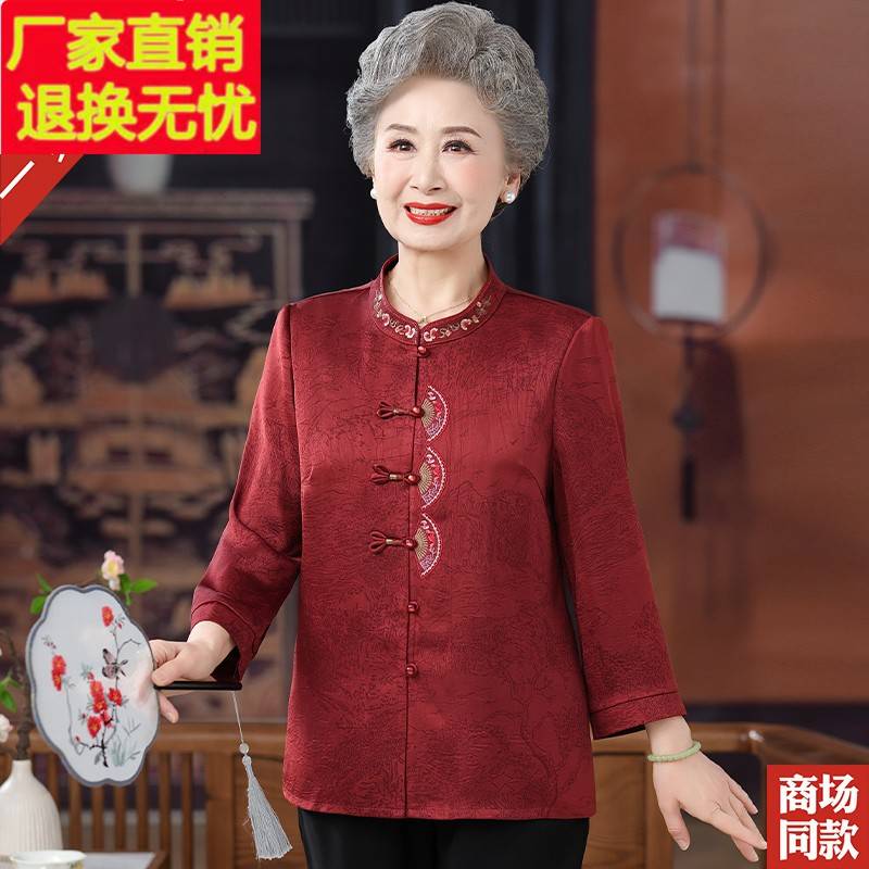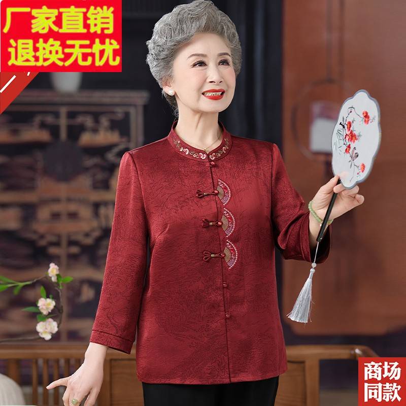 喜婆婆妈妈装红色香云纱上衣新中式老年人夏装桑蚕丝奶奶唐装衬衫