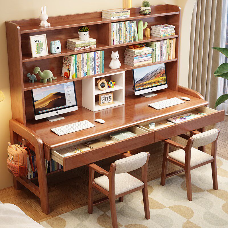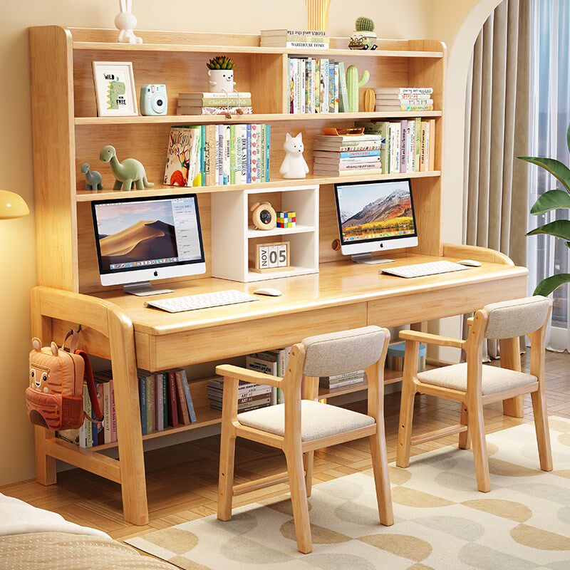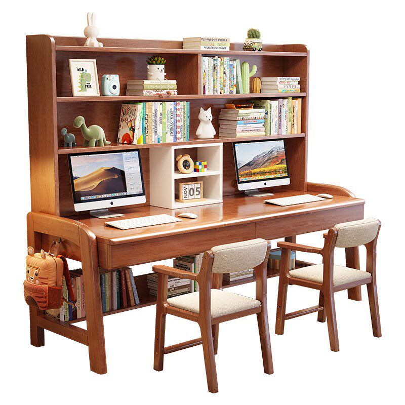 实木双人书桌书架一体家用可升降儿童学习桌书房学生学习桌写字桌