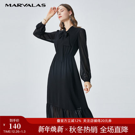 曼德诗连衣裙女夏装2025新款黑色收腰显瘦气质V领雪纺裙子中长款