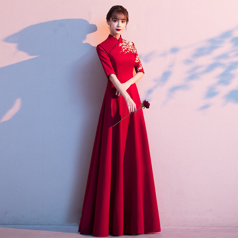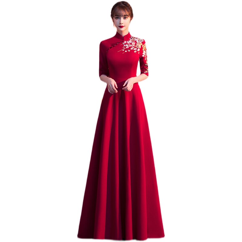 国风旗袍晚礼服2025春秋新款复古中式敬酒服优雅红色长款连衣裙女