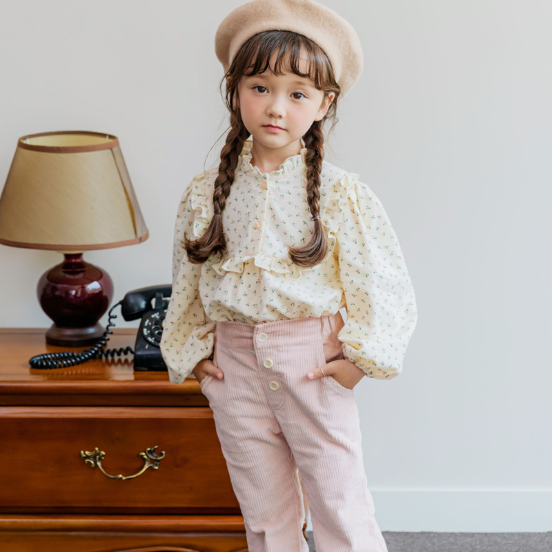bebezoo韩国童装冬季女童碎花衬衫木耳边磨毛长袖棉衬衣淑女风