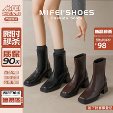 高跟韩系小踝靴绒面马丁靴女鞋2024新款秋冬季加绒方头瘦瘦短靴子