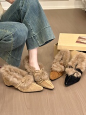 titing气质老钱欧尼!绒面尖头蝴蝶结毛毛单鞋女冬加绒内增高单鞋