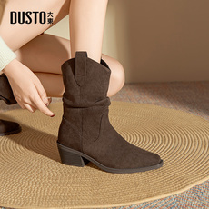 Kmeizu纯皮短靴女秋冬宽松直筒骑士靴显瘦低粗跟中筒靴百搭西部靴