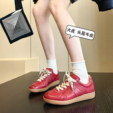 头层牛皮高货+内羊皮软底真皮美式复古德训鞋女鞋子红色休闲板鞋