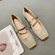 国风布面一字带复古方头玛丽珍鞋女2025年新款浅口软底低跟单鞋