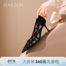 哈森黑色网纱镂空尖头细跟高跟鞋气质浅口单鞋2026新款HWS260133