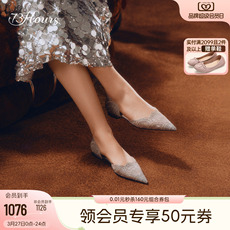 rv水钻绸缎鞋女加绒保暖真皮2025秋季方扣浅口百搭矮跟曼妮灰单鞋