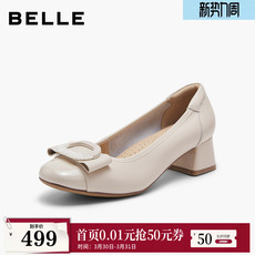 百丽真皮通勤浅口单鞋女2026春季新款粗跟上班不累脚高跟鞋F1X1DA