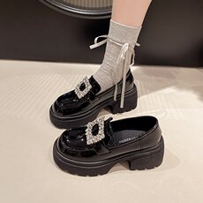 漆皮水钻方扣单鞋女2026秋季新款百搭松糕学院风小皮鞋厚底乐福鞋