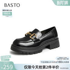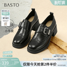百思图2026春季商场新款牛皮粗跟乐福鞋黑色布洛克皮鞋女WA101AM6