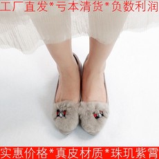 羊猄真皮女鞋子灰色羊皮兔毛毛单鞋低跟圆头蝴蝶结珍珠SF83111032