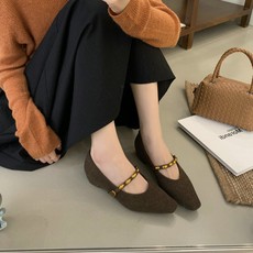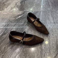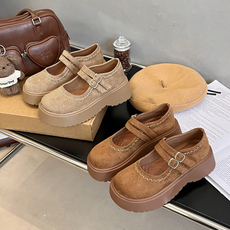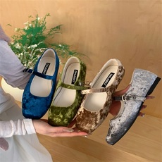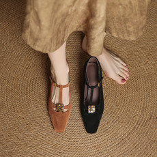 2025年新款法式方头低跟绒面玛丽珍鞋子女一字扣带浅口粗跟单鞋子