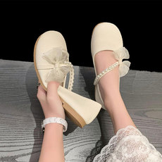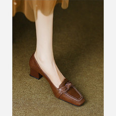 真皮版~复古方头芭蕾舞单鞋小皮鞋气质蝴蝶结浅口复古粗跟高跟鞋