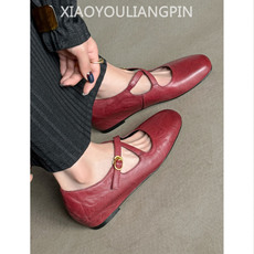 复古方头玛丽珍鞋女2026新款真皮一字扣粗跟单鞋休闲百搭浅口女鞋