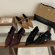 巨好看~气质手工真皮羊翻皮单鞋女方头T带丁字鞋花朵中跟细跟百搭