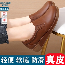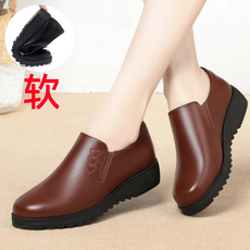 真皮坡跟单鞋妈妈鞋春秋防滑软底软皮中年一脚蹬小皮鞋百搭工作鞋