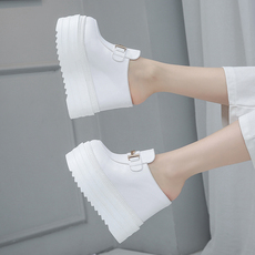 真皮一脚蹬坡跟女单鞋春秋季厚底轻便松糕摇摇鞋中跟软底妈妈鞋女