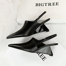 法式坡跟高跟鞋女小众设计2024新款尖头斜口包头凉鞋女后绊带单鞋