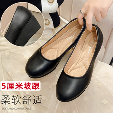 舒适黑色坡跟单鞋服务员圆头工作鞋女中跟皮鞋餐厅浅口女鞋防滑夏