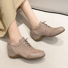 真皮圆头深口系带高坡跟鞋松糕防水台厚底加绒女鞋无内里透气单鞋