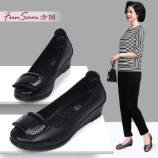 新款女士单鞋牛皮女休闲鞋浅口高坡跟女工作鞋真皮时尚搭扣妈妈鞋