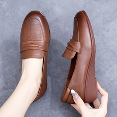 春秋季新款工作鞋女士简约圆头软底浅口真皮单鞋潮流百搭舒适坡跟