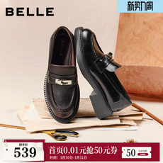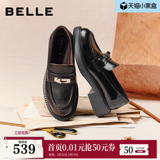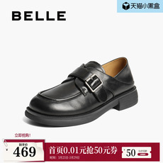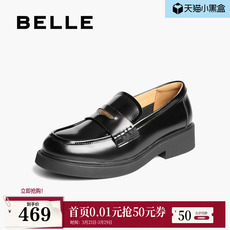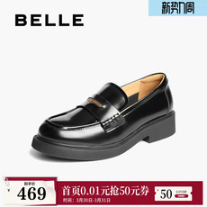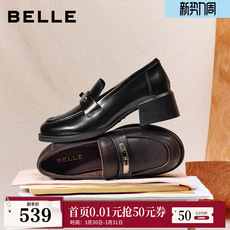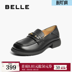 百丽元宝乐福鞋女新款复古英伦风羊皮黑色小皮鞋深口单鞋E9L1DA预